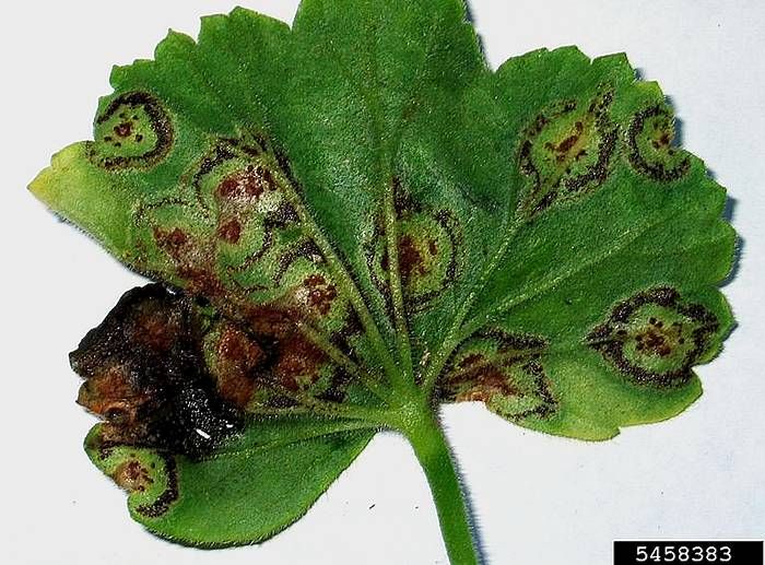 Le champignon responsable cause d’importants dégâts esthétiques aux géranuims et leur affaiblissement progressif.
