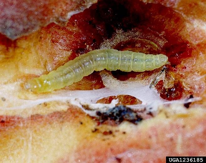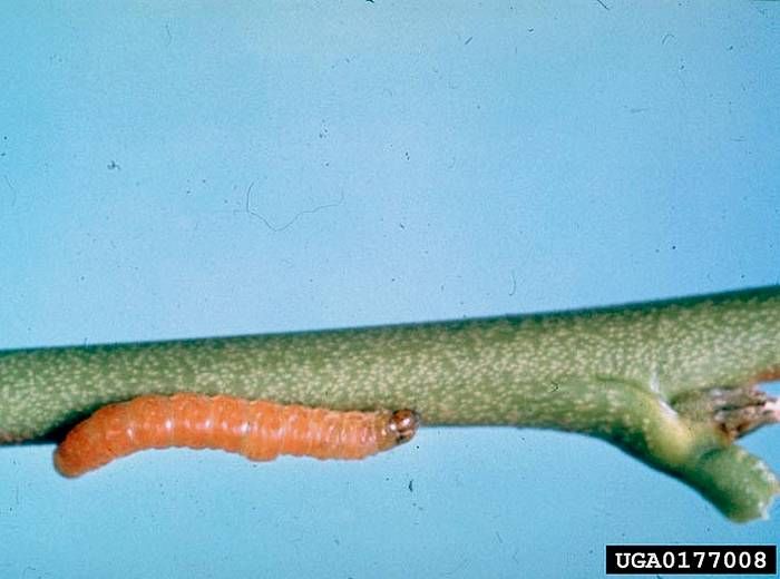 Les chenilles peuvent atteindre 14 mm de long à la fin de leur développement. Leur corps initialement blanc (figure 2) devient rose au dernier stade avant la nymphose (figure 3). La tête est brun clair. Leur développement dure 15 jours à 3 semaines selon la température.