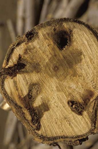 - Trous dans l'écorce presque rond correspondant au trou de sortie de l'insecte adulte