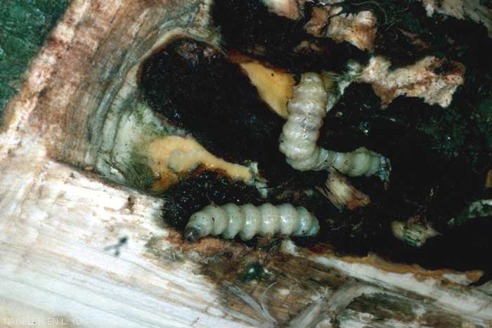 Avec d'autres espèces d'insectes xylèmophages en particulier la grande saperde (larve sans pattes thoraciques).