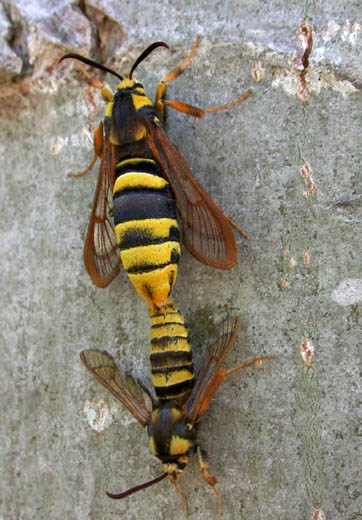 Adulte : papillon mimétique d'un hyménoptère vespidé avec l'abdomen jaune à rayures noires, aux ailes transparentes, de 45 mm d'envergure