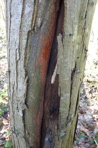 Le champignon se développe au niveau de l'écorce des jeunes tiges ou des brins de taillis, sous forme de taches corticales allongées, à la base des perches, correspondant à des nécroses de la zone cambiale sous-jacente. L'écorce devient brunâtre, se fissure et finit par se desquamer, laissant le bois à nu.
