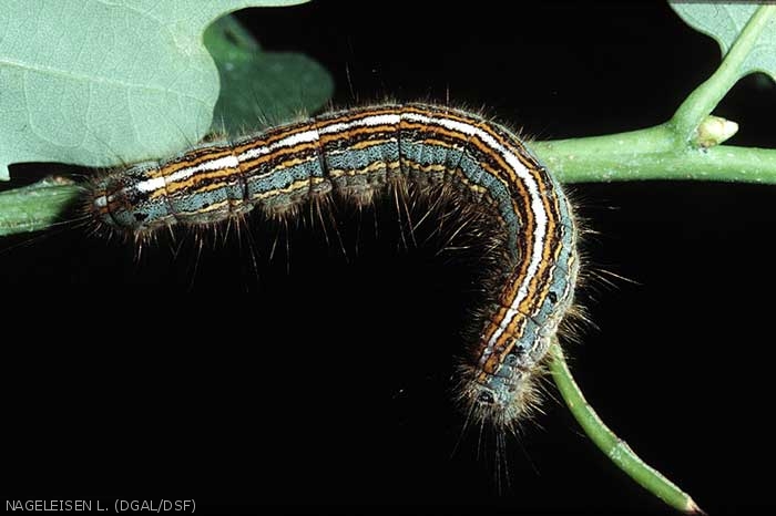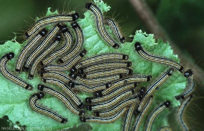Les chenilles éclosent courant avril et ont un comportement grégaire au cours des premiers stades de développement. Elles constituent un "nid" soyeux sur une fourche, à partir duquel elles vont diverger vers les rameaux pour consommer les bourgeons et les feuilles. Elles retournent dans leur tissage en cas d'intempérie et pour les mues. Au fur et à mesure de la progression de la défoliation, elles forment de nouveaux tissages de protection. Restées groupées durant tout leur développement, elles ne se séparent qu'à partir de la dernière mue et terminent leur croissance vers la fin juin.