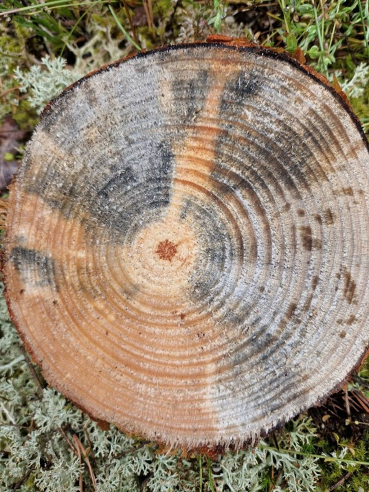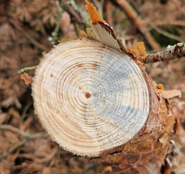 - Bleuissement du bois en quartier à l'aplomb de liber nécrosé en l'absence de galerie de scolytes
