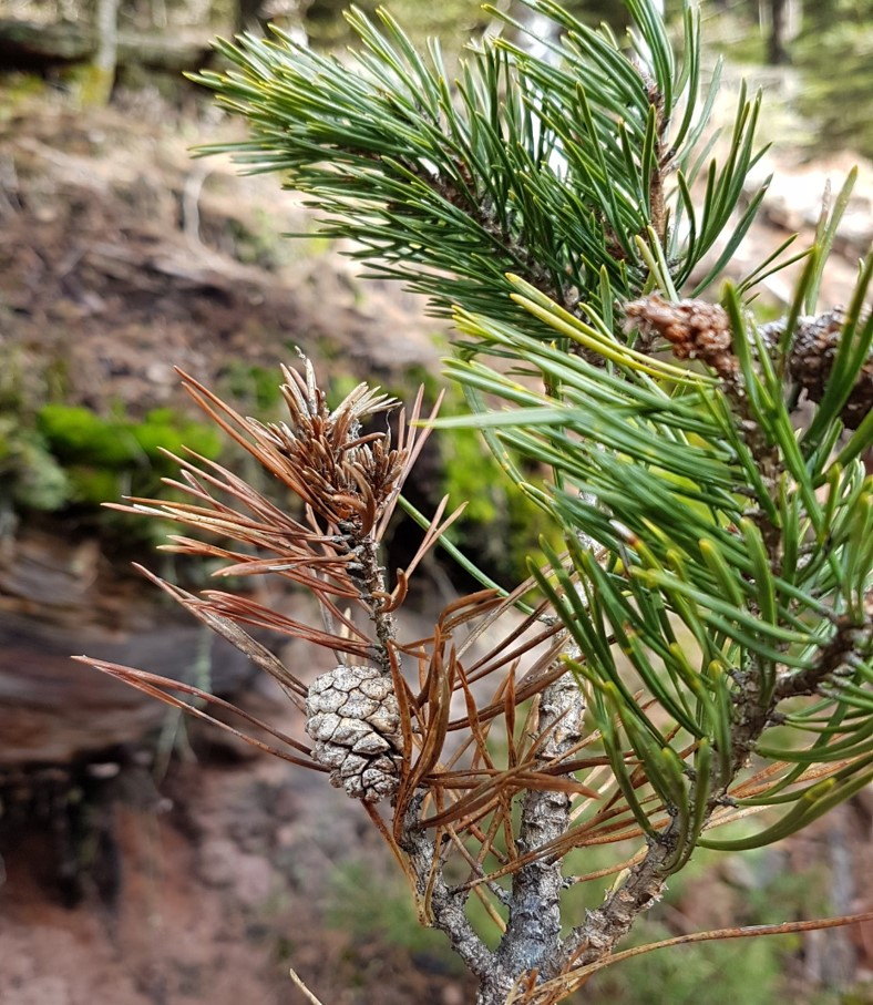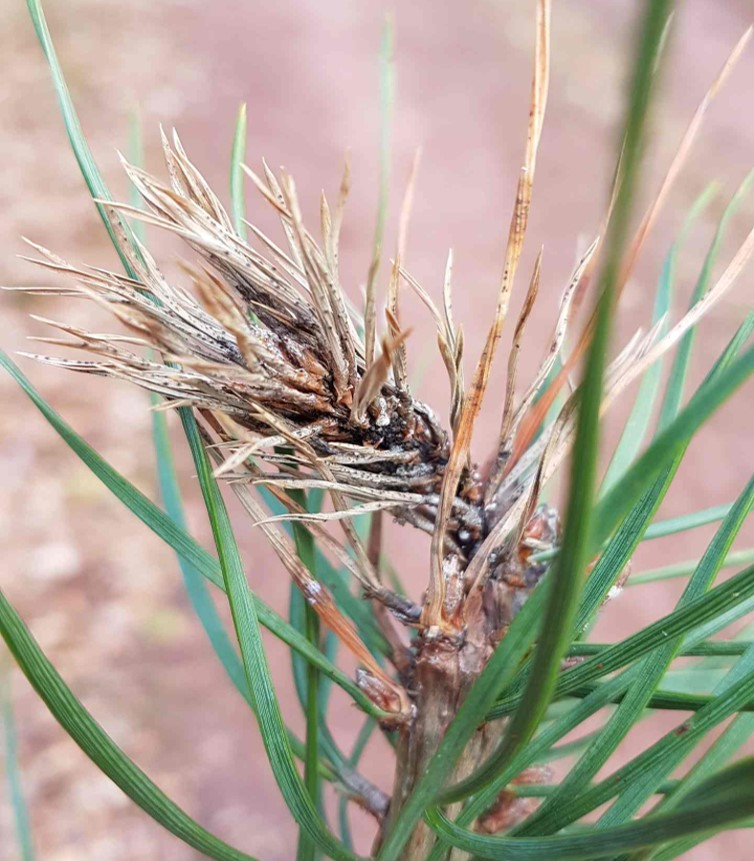 - Les pousses atteintes sont courtes, enveloppées de résine, avec des aiguilles courtes et brunâtres. Si on arrache les aiguilles du fourreau, la base de celle-ci est noire sur 1/2 mm environ. Le dessèchement des pousses de l'année est complet, celles-ci deviennent cassantes. Ces symptômes de dessèchement des pousses sont surtout visibles en plantation. Si la pousse terminale est atteinte, cela peut entraîner une déformation du plant. Apparition de petites fructifications noires, vers la fin de l'été généralement, surtout à la base des aiguilles et sur les rameaux atteints.