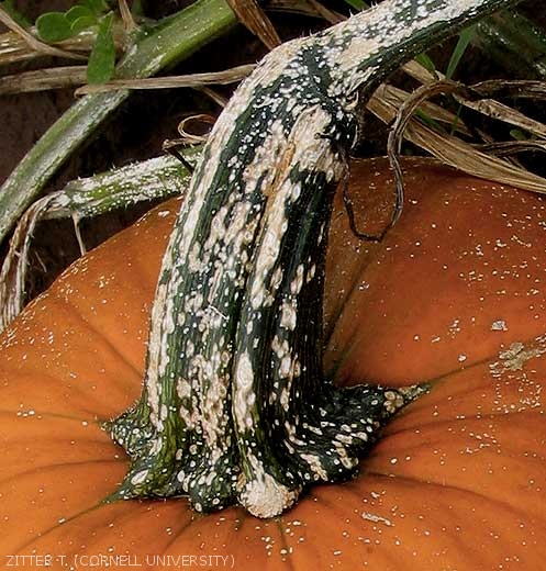 Monographella cucumerina produit des petites lésions blanches de forme allongée à losangique se développant sur le limbe et les nervures des feuilles (figures 1 à 3), les pétioles (figure 4), les rameaux, et les pédoncules (figure 5) des fruits.