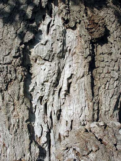 . sur l'écorce : écoulement de sève, présence de sciure brunâtre et jaunâtre qui s'échappe des orifices larvaires ;