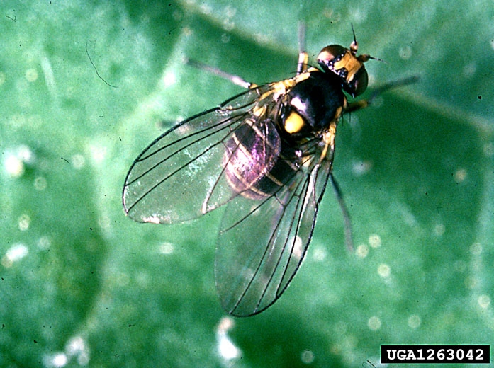 L’adulte est petit et mesure de 1,3 à 2,5 mm de long. Sa tête est jaune, le dessus du corps est gris-noir avec un écusson jaune brillant. Les antennes sont également jaunes. Les femelles adultes piquent les feuilles des plantes afin d’y pondre ou de se nourrir. L. huidobrensis serait un peu plus grand et moins coloré que L. trifolii.