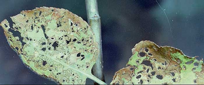 Des trous sont d’abord visibles puis il ne reste qu’un « squelette de feuille », parfois, les feuilles brunissent et tombent.