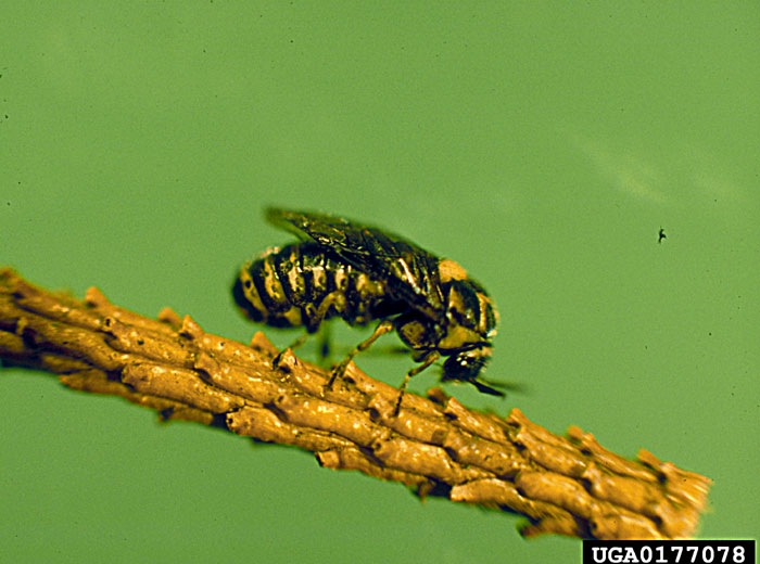 Les adultes apparaissent au début de l’été. Ils ont la forme de guêpes mesurant de 6 à 9 mm de long et sont de couleur noire avec des zones couleur crème. Les mâles sont très rares et la reproduction de cet insecte a majoritairement lieu par parthénogénèse (mode de reproduction asexué). Les femelles entaillent l’extrémité des vieilles aiguilles (aiguilles de l’année précédente) pour y pondre leurs oeufs un à un. Les oeufs sont verts et éclosent au bout de 10 jours.