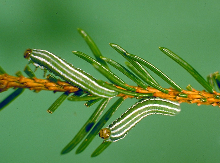 Les larves ressemblent à des chenilles de lépidoptère, elles sont vertes avec des bandes longitudinales claires et mesurent entre 3 et 20 mm de long. Elles se nourrissent de vieilles aiguilles principalement car il semble que les aiguilles de l’année en cours contiennent des molécules répulsives. Six stades larvaires se succèdent sur une quarantaine de jours. Ensuite, les larves se laissent tomber au sol et font leur cocon pour passer l’hiver dans la litière du sol ou les mousses.