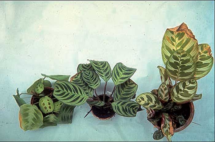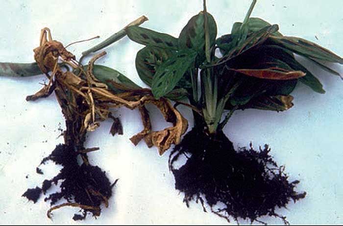 D’aspect, les plantes développent des feuilles moins nombreuses, plus petites et moins colorées. La partie inférieure des tiges se met à pourrir et la croissance des plantes est ralentie, elles se nanifient.