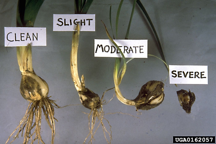 Les bulbes présentent d’abord des crevasses au niveau du plateau basal et développent du bas vers le haut des lésions gris-noires au sein des écailles les plus charnues. Les bulbes finissent par se dessécher.