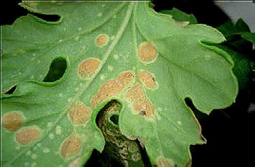 Les feuilles peuvent se dessécher, se recroqueviller et tomber si elles sont fortement atteintes. De même, en cas de forte contamination, les tiges et les bractées présentent des taches. La plante entière peut mourir.