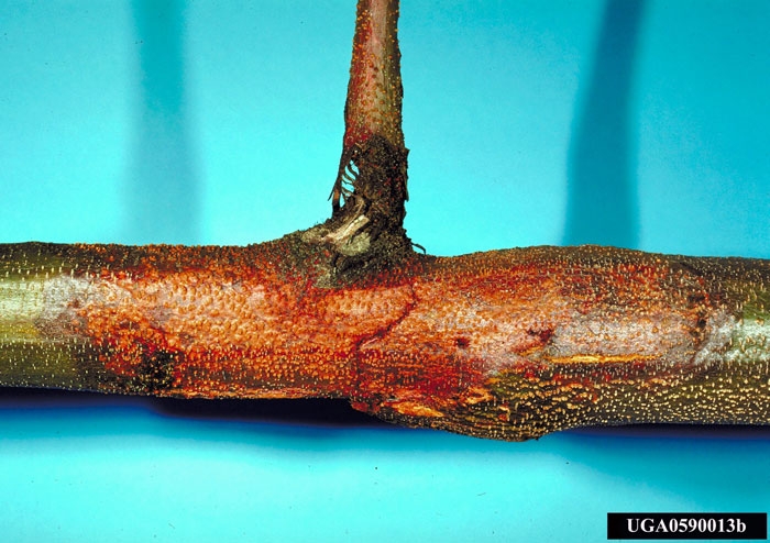 Des pustules rouge-orangé de 1 à 2 mm de diamètre apparaissent à la surface de l’écorce, ce sont les périthèces. Sous conditions humides et douces, des vrilles jaunes émergent également du bois, elles correspondent aux pycnides.