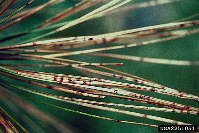 Des bandes ou points nécrosés apparaissent sur les aiguilles. En fin d’automne ou en hiver, ces taches évoluent en bandes rouges qui encerclent les aiguilles. La couleur rouge est liée à la production de toxines de la part du champignon.