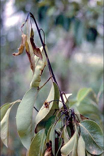 En parallèle, les jeunes pousses et rameaux contaminés flétrissent, prennent une couleur brun-noir sur poirier et brun-rouge sur pommier, et s’enroulent en crosse. Leurs feuilles atteintes brunissent et présentent des taches nécrosées qui leur donnent un aspect brûlé, d’où le terme de feu bactérien. Tous ces organes atteints restent fixés aux branches.