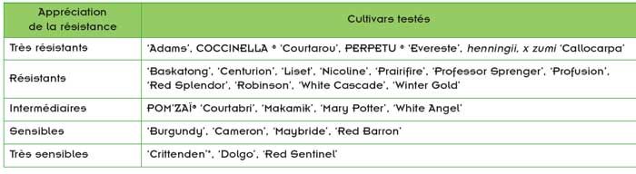 Concernant les Malus d’ornement, l’Inra a effectué des observations en vergers et en conditions contrôlées pour déterminer la sensibilité de 26 cultivars après une inoculation de la bactérie (voir Figure1).