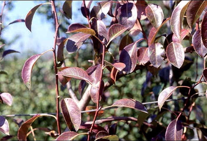 Pour les raisons évoquées précédemment, les symptômes de la maladie ont le plus de chance d’apparaître suite à un printemps connaissant une forte pression de psylles. Dans ce cas, les symptômes peuvent apparaître dès l’été, 2 mois après l’infestation. Mais, ils sont souvent plus visibles à l’automne du fait de la coloration atypique du feuillage des plants atteints. D’autre part, l’expression des symptômes est variable selon la sensibilité du porte-greffe, l’âge et l’état physiologique de l’arbre.