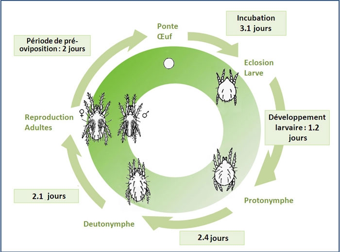 Ci-dessus le cycle de développement d'Amblyseicus cucumeris à 25°C.