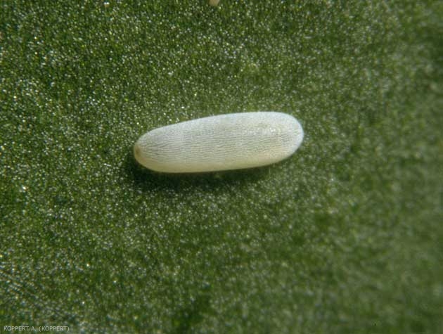 Les oeufs (figure 1) sont blancs, ovoïdes et facilemement visibles à l'oeil nu. Ils mesurent 1mm de long.