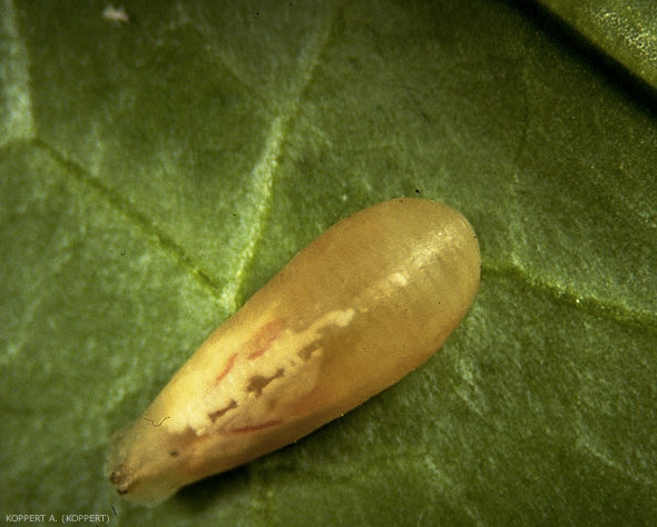 Les pupes (figure 4) ont la forme de goutelettes, elles mesurent 7.5 mm de long, sont marron-orangées plus ou moins pâles, avec des bandes foncées ondulées. La nymphose a lieu sur la face inférieure des feuilles.