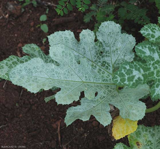 Sur cucurbitacées les feuilles peuvent révéler une coloration argentée (figures 8 et 9). Ce désordre physiologique, dénommé Argenture, est induit par l'activité parasitaire des nymphes et des adultes de l'aleurode Bemisia tabaci (Genn.) biotype B, également connu sous le nom de B. argentifolii Bellows & Perring . Dautres biotypes d'aleurodes ont été associés localement à ce désordre sur Cucurbitacées (dans l'Océan Indien et en Afrique). Cette maladie a été observée dans les années 1960 en Israël, et dans les années 1980 dans le sud des Etats-Unis (Floride) et au Moyent-Orient. Elle a accompagné l'extension de cette aleurode dans le monde et se manifeste maintenant dans de nombreux pays. Elle a été observée pour la première fois en France au début des années 1990.