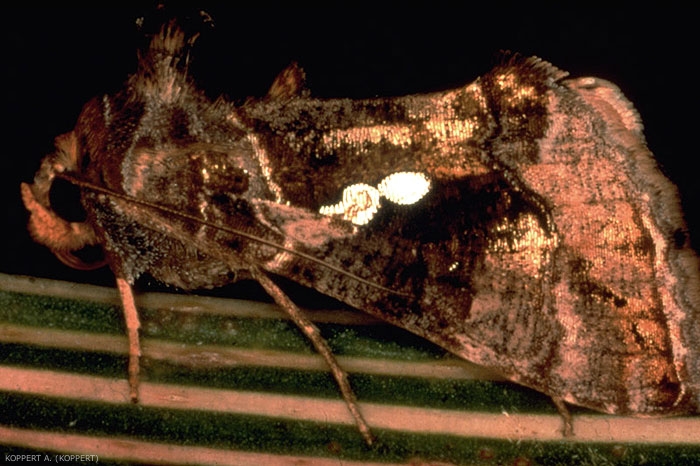 Adulte : envergure de 32 à 37 mm, majoritairement de couleur marron or (d’où son nom Chrysodeixis, qui signifie « brillant or ») et arbore, sur l’aile antérieure, deux taches blanches très visibles, en forme de goutte, qui se superposent parfois (figure 4). Elle possède des ailes postérieures marron, des antennes longues et fines, et le corps marron et pileux. Lorsque le papillon est au repos, on distingue nettement sa crête velue le long de la face dorsale.