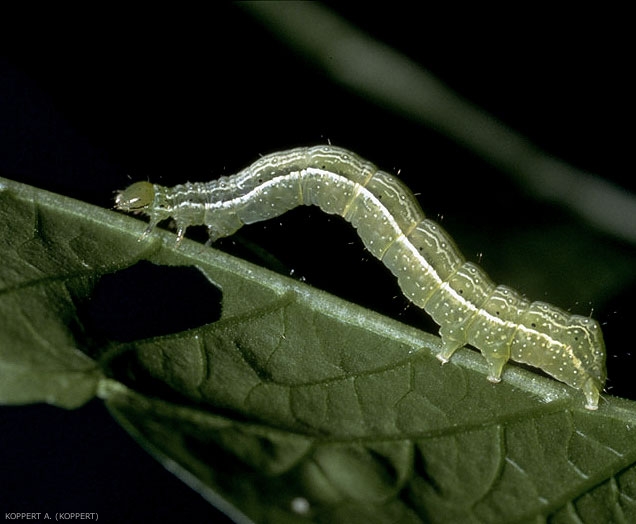 Chenilles : tête verte, corps vert jaunâtre parsemé de petits poils rigides sur la face dorsale, avec une bande longitudinale jaune clair de chaque côté, et de nombreuses petites rayures claires moins accentuées Les plus âgées ont deux paires de fausses pattes abdominales au lieu de cinq et, sur chaque segment, un point noir au-dessus des lignes jaunes latérales. Elles se déplacent en arpentant. Le dernier stade larvaire mesure environ 40 mm de long. Les chenilles de cette espèce sont très agressives ; elles peuvent attaquer leurs congénères ou même s’entre-tuer lorsqu’elles sont trop nombreuses (figure 3).