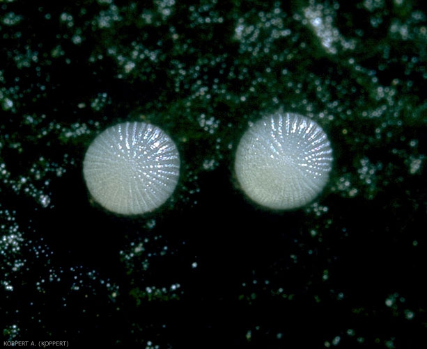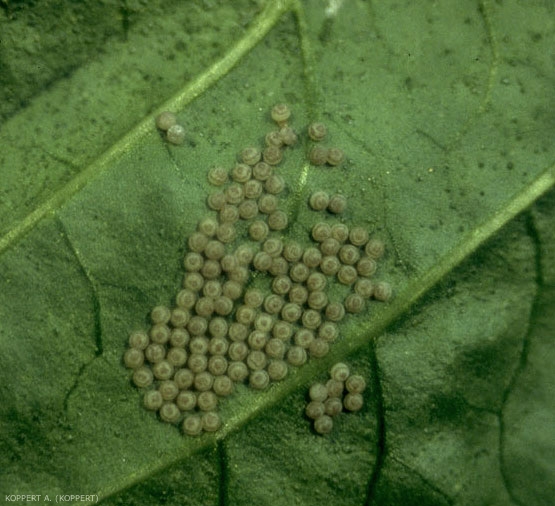 Oeufs généralement pondus isolément, répartis dans toute la culture (figures 1 et 2). On les observe souvent à la face inférieure des feuilles.