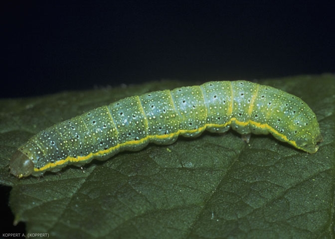 Chenille : possède quatre paires de pattes abdominales et peut mesurer jusqu’à 50 mm (figures 3 et 4). Ses deux premiers stades larvaires ont la tête vert pâle, puis blanche à marron-gris tacheté. Les dessins qu’elle porte varient selon la plante hôte et le stade de développement : au départ, le corps est vert brillant, puis une ligne jaune ornementée de points noirs apparaît, bien distincte de chaque côté du corps de l’insecte. Les chenilles plus âgées sont vert clair à marron clair ou parfois rougeâtres, avec, sur la face dorsale, trois rayures gris foncé partiellement atténuées par les traits gris-noir qui se trouvent en dessous. Une autre rayure grise longe le corps juste au-dessus des lignes latérales jaunes. Chaque segment possède plusieurs rayures plus foncées sur les côtés et sur le dos.