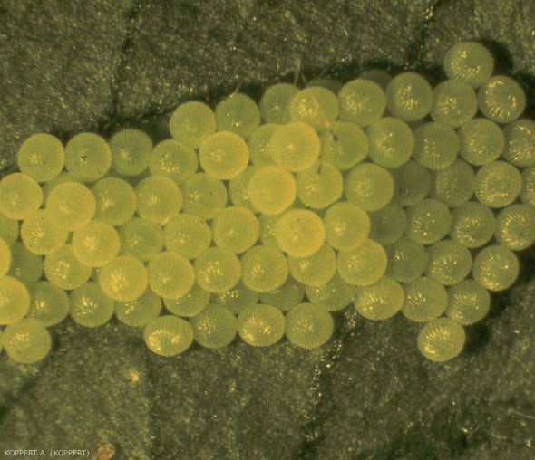 Les femelles déposent leurs œufs sphériques à la face inférieure des feuilles par groupes de 50 à 300, souvent disposés en rangs (figure 5).