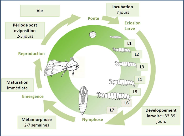 En climat tempéré, les œufs et les adultes sont observés à l’extérieur en Juin et en Juillet, les chenilles de Juillet à Août, et les nymphes d’octobre au mois de mai de l’année suivante.