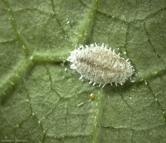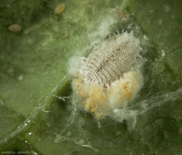 Oeufs : pondus dans une espèce de sac allongé cotonneux, composé de filaments blancs cireux produit par la femelle et qui est situé dessous et derrière son corps (figure 2). Les œufs eux-mêmes sont jaune clair, ovales à ronds, et séparés les uns des autres par une couche de cire.