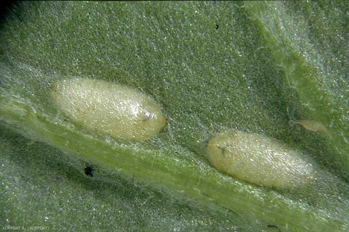 Oeufs : ovales, blancs et lisses, 0,35 x 0,15 mm de long.