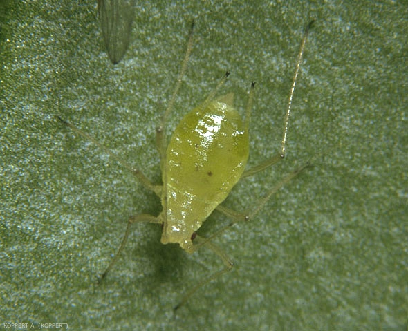 Les individus ailés existent sous deux formes, claire ou foncée. Chez les formes claires, la tête et le thorax sont marron clair, alors que la face dorsale est verte, sans pigmentation. Elles présentent une grande tache sombre à la base des tubercules. Chez les formes foncées, la tête et le thorax sont marron-noir, les antennes marron et l’abdomen porte des taches sombres et des stries transversales. La cauda est marron-gris.