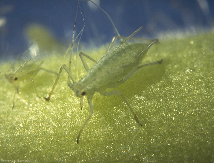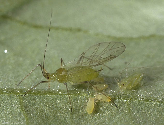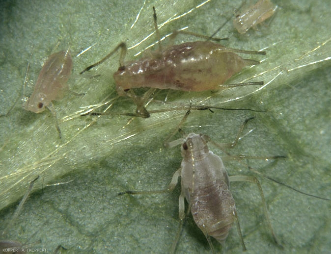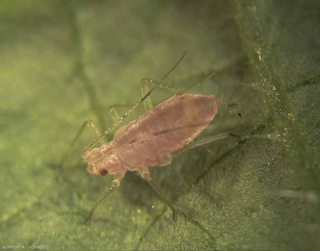 Le puceron vert et rose de la pomme de terre apparaît principalement en été et a besoin soit d’un climat doux, soit d’une serre pour survivre pendant l’hiver.