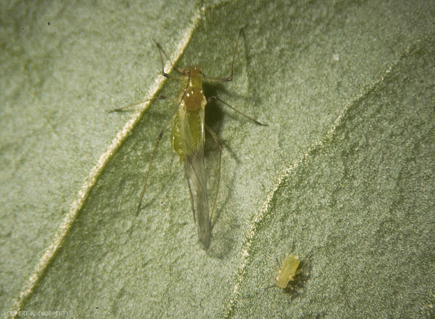 Les femelles ailées sont légèrement plus petites que les formes aptères. Les ailés roses ont la tête jaunâtre et le thorax jaune rosâtre. Les pucerons se laissent tomber de la plante lorsqu’on les touche.