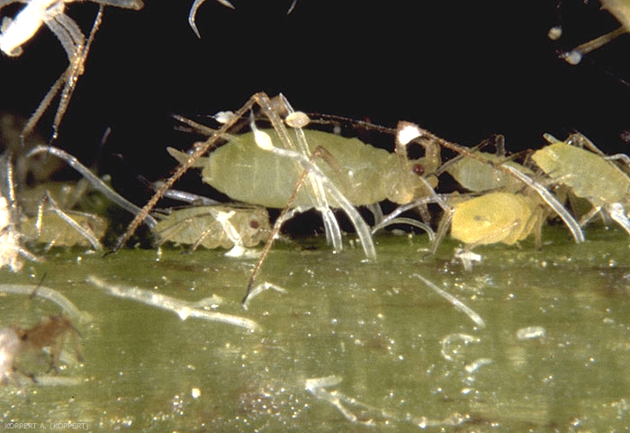 Les formes aptères mesurent entre 1,7 et 3,6 mm de long, sont fusiformes et présentent une ligne longitudinale foncée sur la face dorsale (figures 1, 2, 3, 5 et 7). Cette bande longitudinale est très caractéristique et est particulièrement visible chez les larves. Chez les pucerons verts, elle est vert foncé, alors qu’elle est rouge foncé chez les individus roses. Entre les deux antennes, la tête est légèrement bombée, du fait de la présence des deux tubercules frontaux divergents. Les antennes, qui sont plus longues que le corps, possèdent des anneaux foncés très distincts. Les cornicules sont extrêmement longues, marron clair avec les extrémités foncées et légèrement recourbées vers l’extérieur. La cauda est également très longue, étroite, digitiforme, soit incolore soit marron clair. Les yeux sont rouge vif.