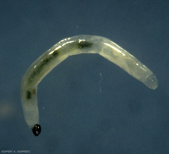 Larves : peuvent atteindre entre 5 et 12 mm de longueur et 0,5 à 1,5 mm de diamètre. Elles sont apodes et leur tête remarquable est noire. Il y a 4 stades larvaires qui sont morphologiquement identiques. Au départ, les larves ont les téguments transparents et la capsule de la tête brune (figures 1 et 2), celle-ci fonce progressivement jusqu'a devenir noire. Le contenu du tube digestif devient marron. Au quatrième stade, la larve de couleur blanche est pratiquement opaque. La tête est pourvue d'un appareil buccal de type broyeur.