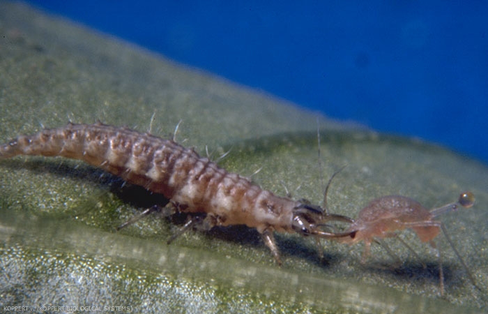 | Efficacité | larves : freinées par la présence de poils sur les feuilles ; nocturnes : 300 et 400 pucerons au cours de son développement. Cette quantité dépend de l'espèce de puceron consommée, et de la température. La consommation de l'insecte durant le dernier stade larvaire represente environ 75 % de sa prédation totale. |