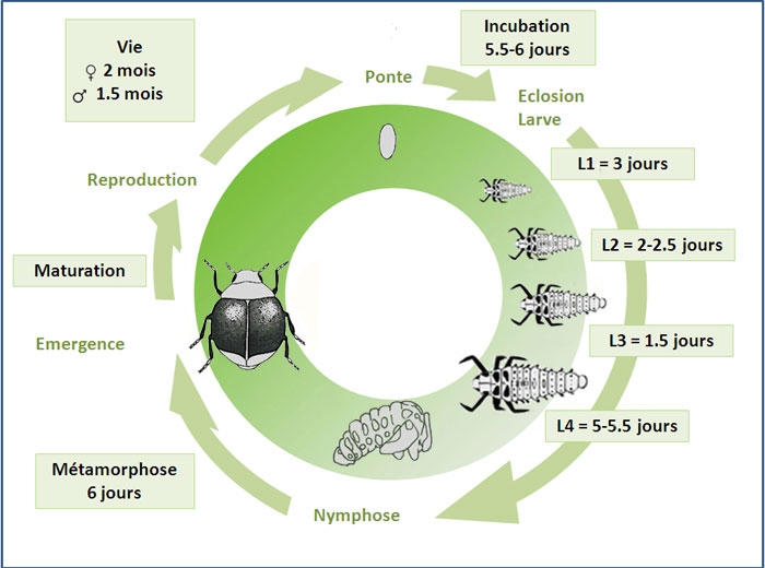 Ci-dessus le cycle de développement de Delphastus pusillus.