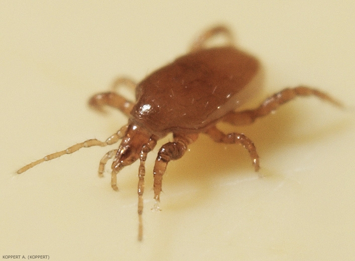 L'adulte (figure 1 et 2) mesure 0.6 à 0.8mm, et est de couleur brune. Les larves et le premier stade larvaire sont blancs.