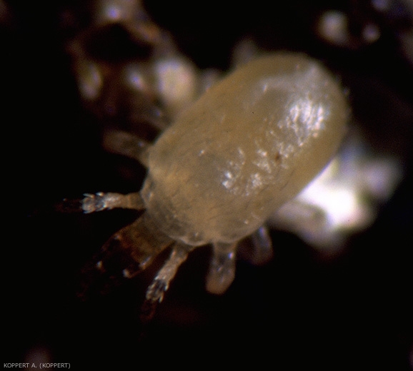 Ces petits acariens sont marron clair mat (figures 1 et 2), avec des mâchoires plus foncées, et mesurent 0.5-1mm. Ils sont arrondis avec la face dorsale fuselée, et possèdent des soies lisses sur les pattes. Leurs chelicères sont développées et leur dos assez velu. Les mâles sont plus petits et plus rares que les femelles. Ces dernières ont une ligne blanche sur la partie terminale du corps.