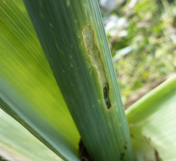 - sur poireaux : minées (figure 1), perforées, en partie consommées (figure 2), les feuilles finissent par présenter un aspect lacéré les rendant invendables, installation de divers agents de pourriture.