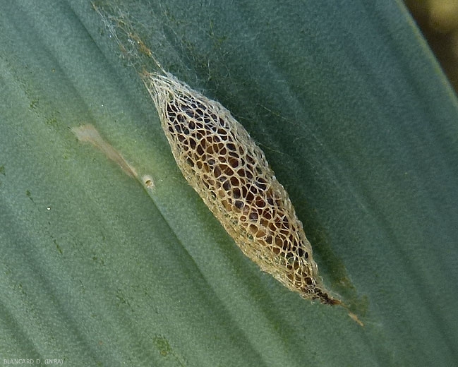 Cocon (figure 2) : fusiforme à mailles lâches, fixé à la feuille, à la hampe florale ou aux pédoncules floraux .