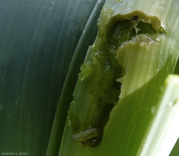 Après l'éclosion, les larves minent les feuilles puis, après 2 à 5 jours, elles quittent les mines pour s'enfoncer à l'intérieur des poireaux entre les feuilles centrales .