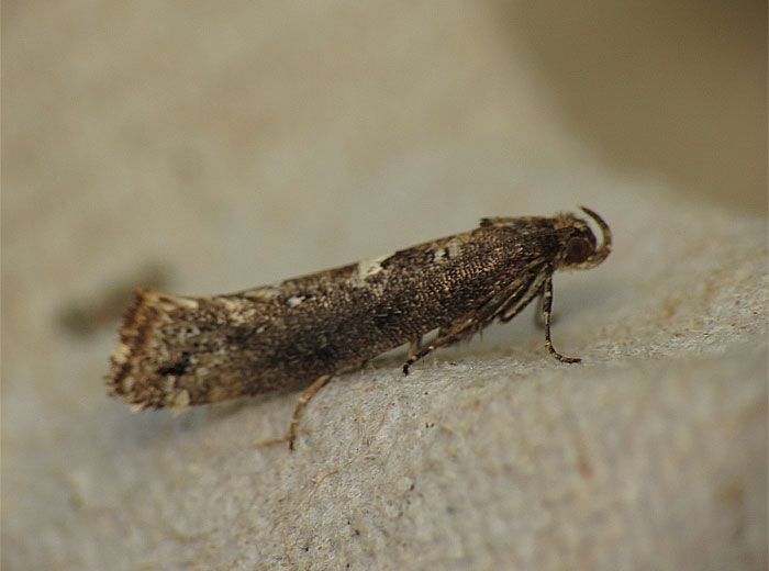 Adulte (figure 3): 16 à 18 mm d'envergure, tête rougeâtre, une paire d'antennes, un thorax et un abdomen brunâtres. Ailes antérieures étroites, rectangulaires, brun grisâtre, parsemées de taches noirâtres et ornées de 2 taches blanches au bord inférieur. ; ailes postérieures effilées et de couleur gris clair.
