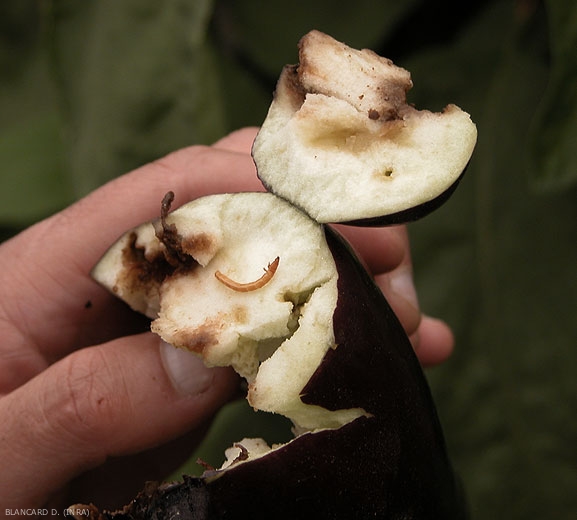 - Symptômes : Des perforations et des galeries plus ou moins étroites et profondes peuvent être observées sur ces organes et sur certaines plantules (figure 1) ; répercussions sur la vigueur des plantes qui peuvent avoir une croissance plus faible, flétrir, voire dépérir entièrement. La production et/ou la valeur commerciale des tubercules, des fruits (melon, aubergine...) (figures 2 et 3)... récoltés peuvent être respectivement fortement diminuée, et dépréciée.