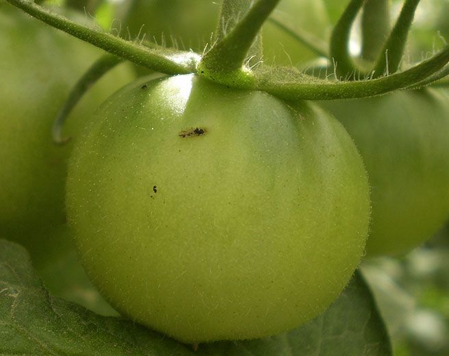 • Fruits : ceux verts ou mûrs sont parasités; ils sont plus ou moins parsemés de galeries et de trous de sortie (figures 3 et 4). Ces derniers permettent parfois à des envahisseurs secondaires de provoquer diverses pourritures, ceci en cours de cultures et durant leur conservation. Notons que les fruits parasités sont bien souvent invendables. Nécroses sur le pédoncule, ou sur d'autres endroits sur tomates.